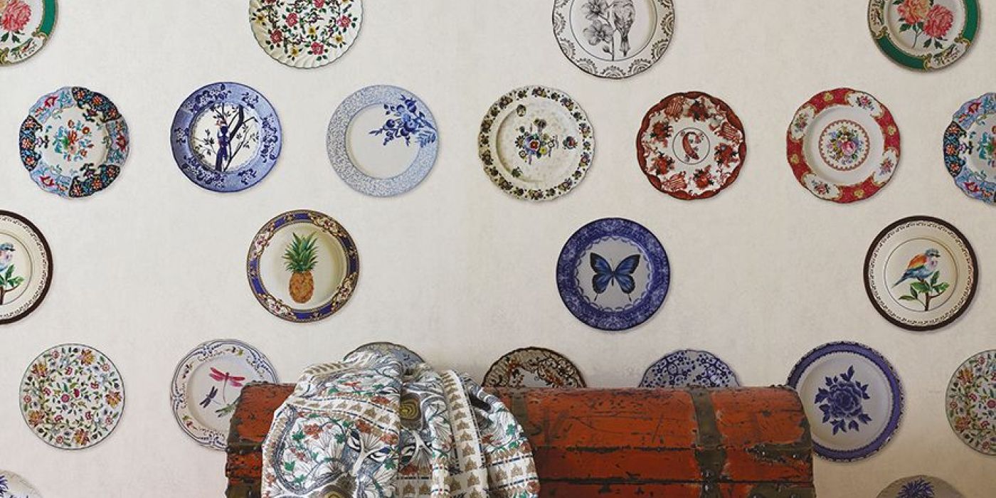 El papel pintado ha colonizado con éxito todas las estancias de nuestros hogares. Pasillos, salones, dormitorios, cuartos infantiles e incluso baños, comedores y cocinas. Pensando en estas últimas dos estancias, en unos días instalaremos en nuestra exposición este vistoso mural de platos de cerámica diseñado por Mathew Williamson para Osborne & Little. Pronto os lo mostraremos en nuestras redes. ¡Atentos!