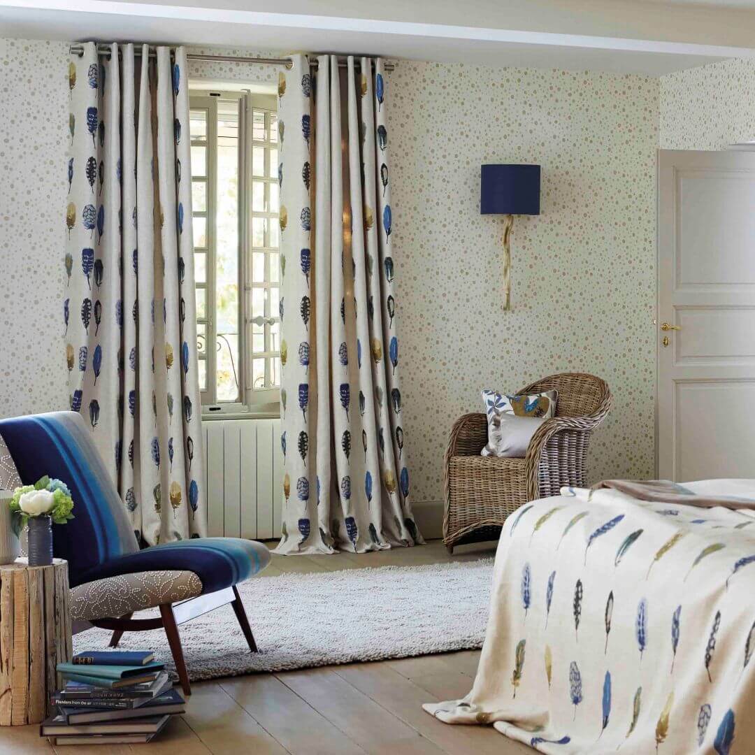 Bandas con textura natural e impresión de plumas en tonos azules y oliva. Limosa es un tejido de Harlequin con una magnífica caída y suavidad.