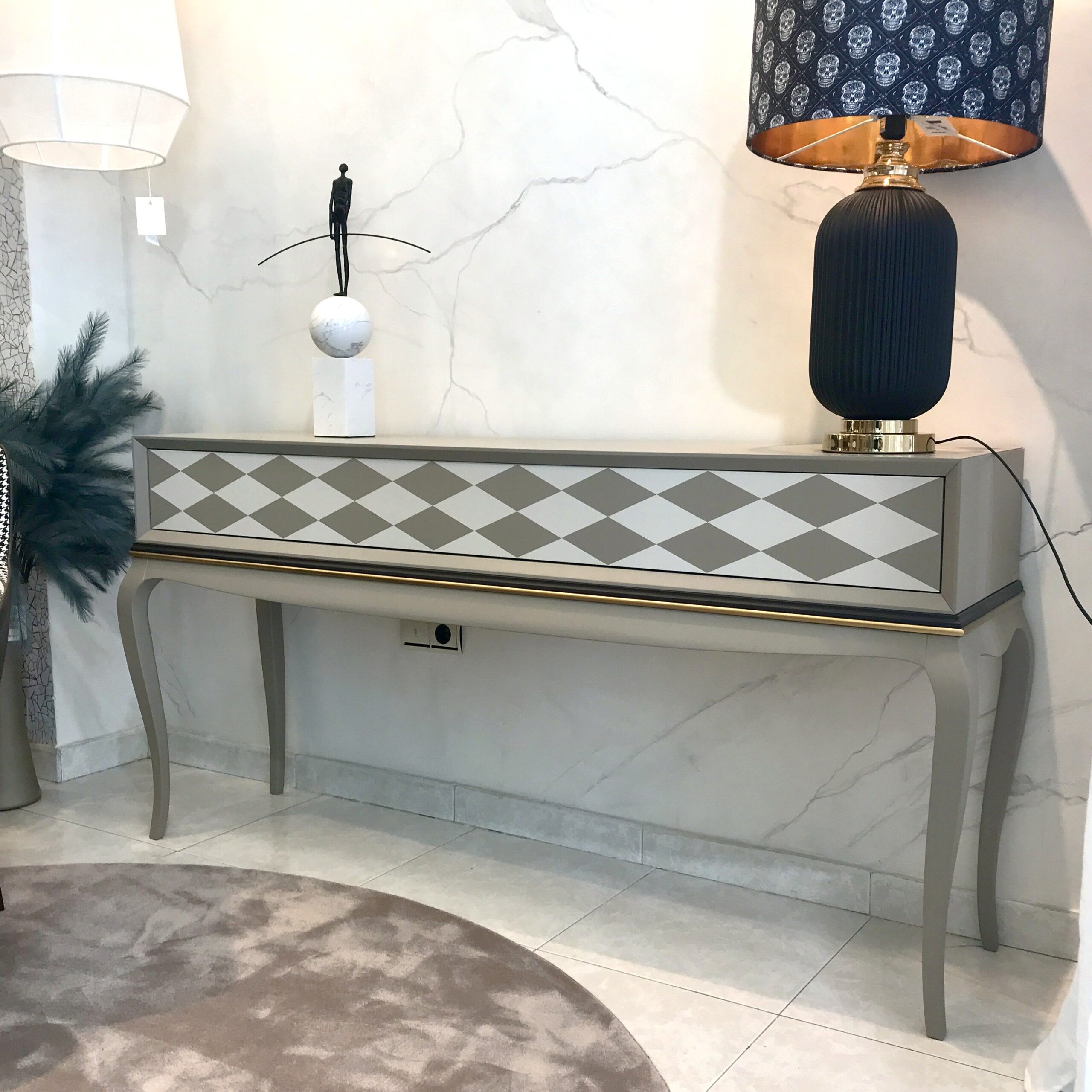 Una consola con mucha personalidad que lo mismo decora que organiza con estilo. La consola Armura mezcla líneas clásicas con un aire contemporáneo gracias a su diseño de rombos en el frente y su elegante combinación de colores. Perfecta para dar ese toque especial a un recibidor, pasillo o incluso detrás de un sofá.
