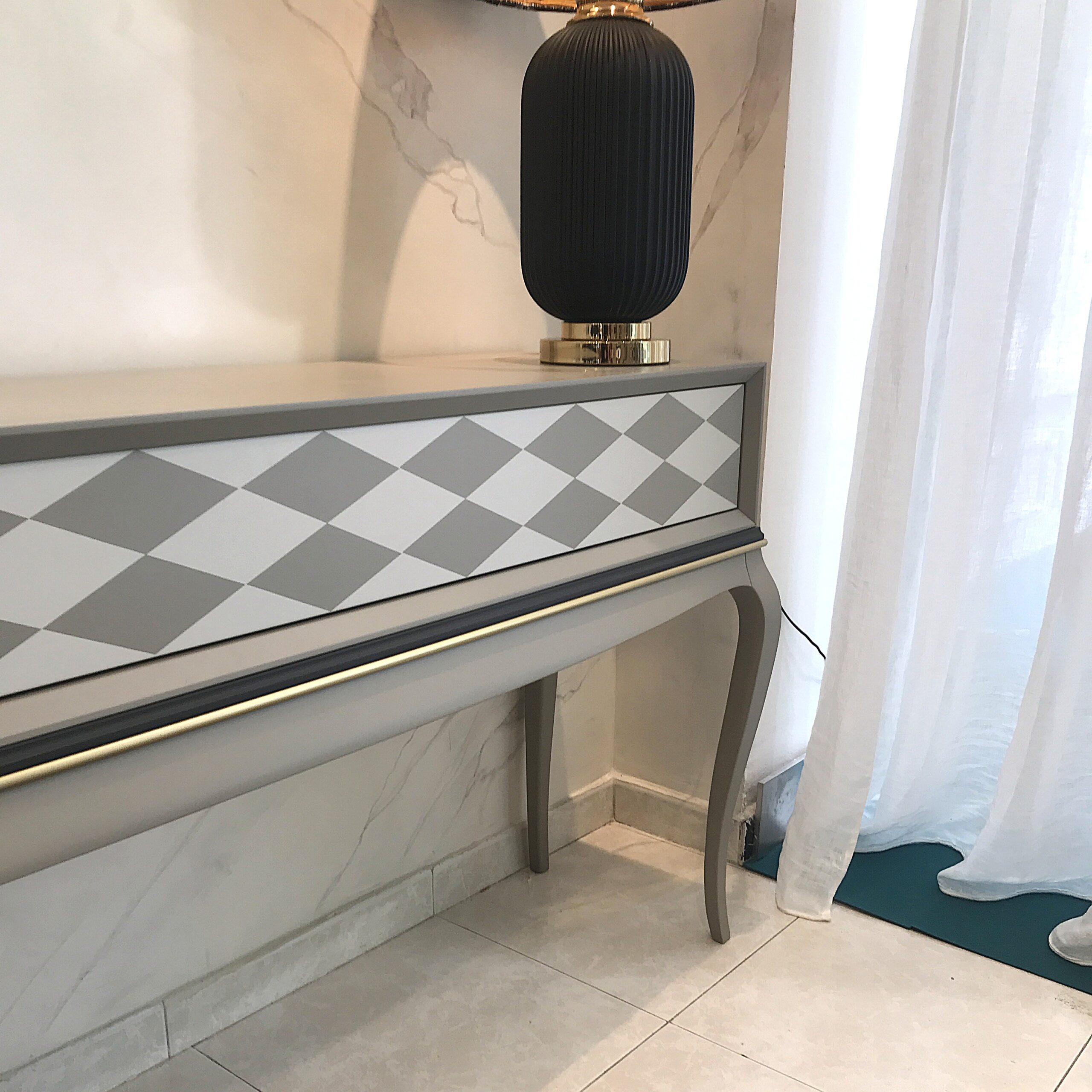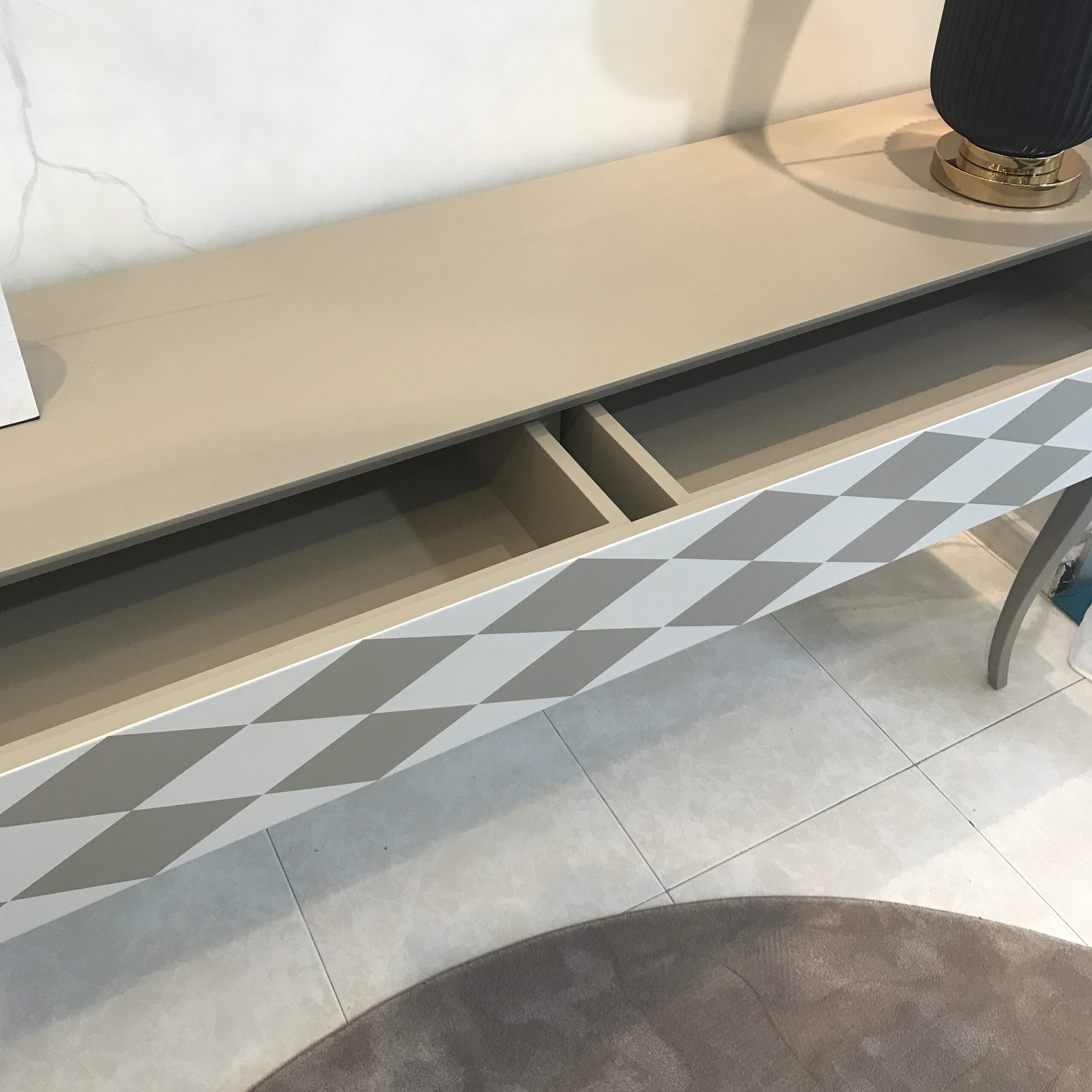 Estructura lacada en acabado mate de alta calidad, combinando tonos topo y almendra en el frente con diseño geométrico de rombos. Detalle de moldura en negro y dorado que enmarca con elegancia. Dispone de un cajón único dividido en dos compartimentos interiores, con sistema push para una apertura limpia y sin tiradores.