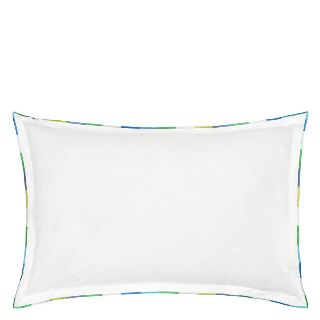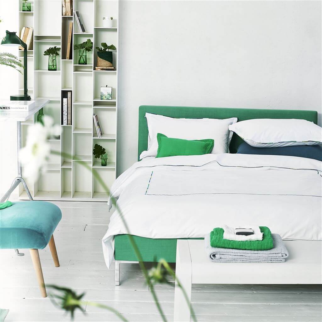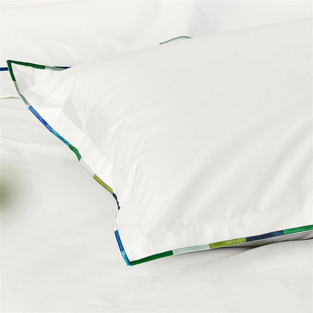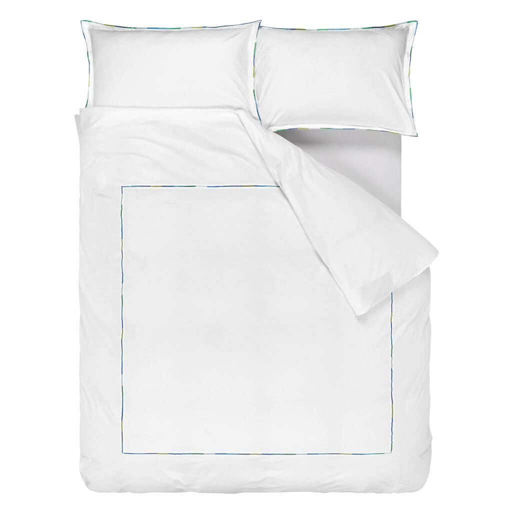 Pimlico de Designers Guild es una funda nórdica luminosa, de un blanco impecable,  realzada con bordados vibrantes en dos gamas cromáticas: Peony y Acqua. Está fabricada en un lujoso percal de algodón de 300 hilos.