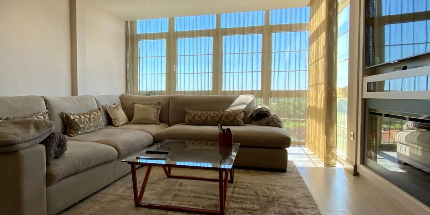 La arquitectura de este elegante piso ubicado en Tudela crea amplios espacios en los que la luz que atraviesa los grandes ventanales es absolutamente protagonista. Sus propietarios han elegido cada uno de los muebles para que se integren perfectamente en el conjunto, y la decoración textil que proyectamos tenía que reforzar esa unidad de estilo.
