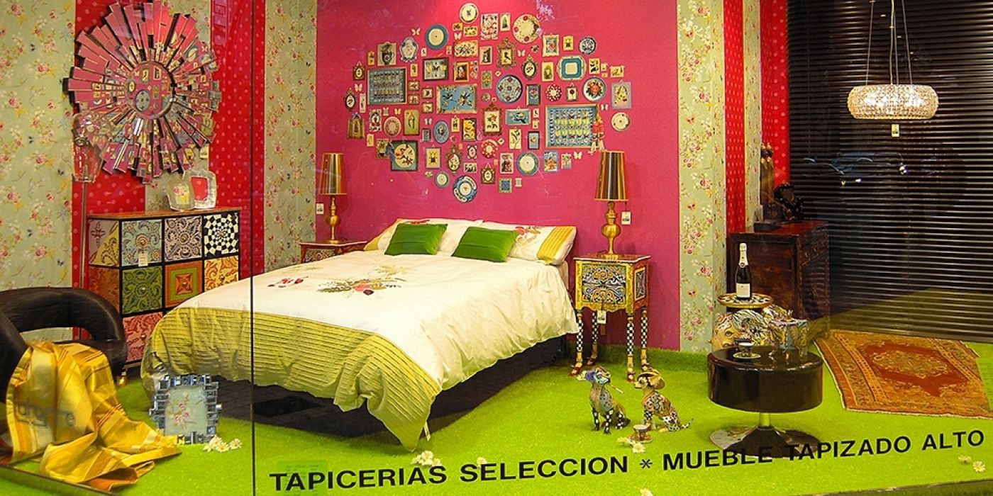 Sobre todo en este post queremos mostrar el escaparate izquierdo. En él, encontramos todo lo necesario en un dormitorio para una pareja. Aunque puede parecer que este ambiente debe ser más formal, puede resultar igual de divertido que el dormitorio infantil que tiene al lado. Repleto de colores llamativos, formas originales y esculturas del artista Toms Drag; a este escaparate no le falta detalle.